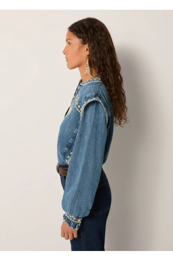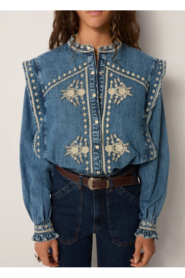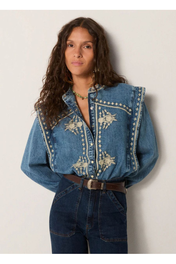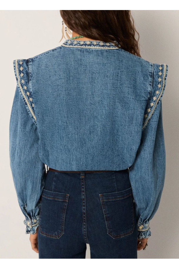 Confeccionada en denim suave de lavado medio, se distingue por los bordados geométricos y florales en contraste claro que recorren el delantero y los hombros, realzando la textura del tejido con un aire folk refinado.