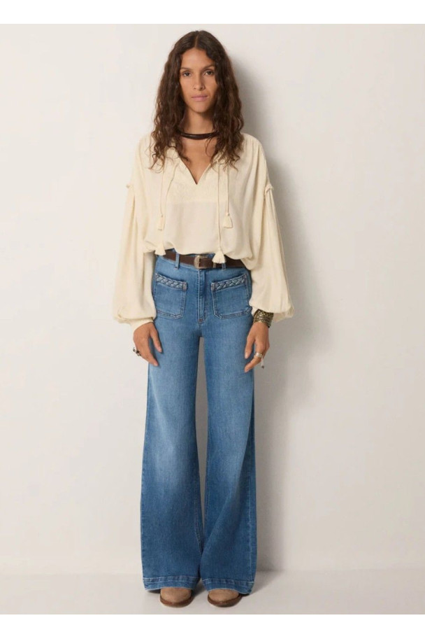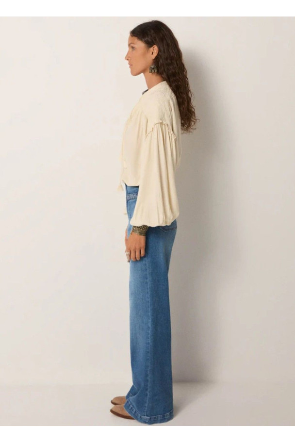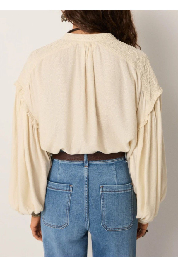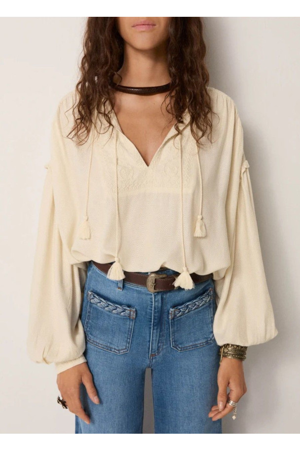 Su tono marfil suave y su caída vaporosa hacen de esta blusa una prenda versátil, perfecta para combinar con denim o faldas fluidas, creando un look effortless con inspiración vintage.
