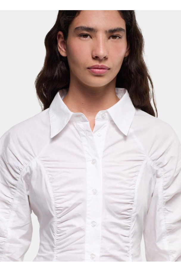 Confeccionada en un ligero popelín , ofrece comodidad y una forma impecable. Su bajo, formado por pequeñas piezas que crean un efecto ligeramente acampanado y con volumen, aporta movimiento y una forma única a la prenda.