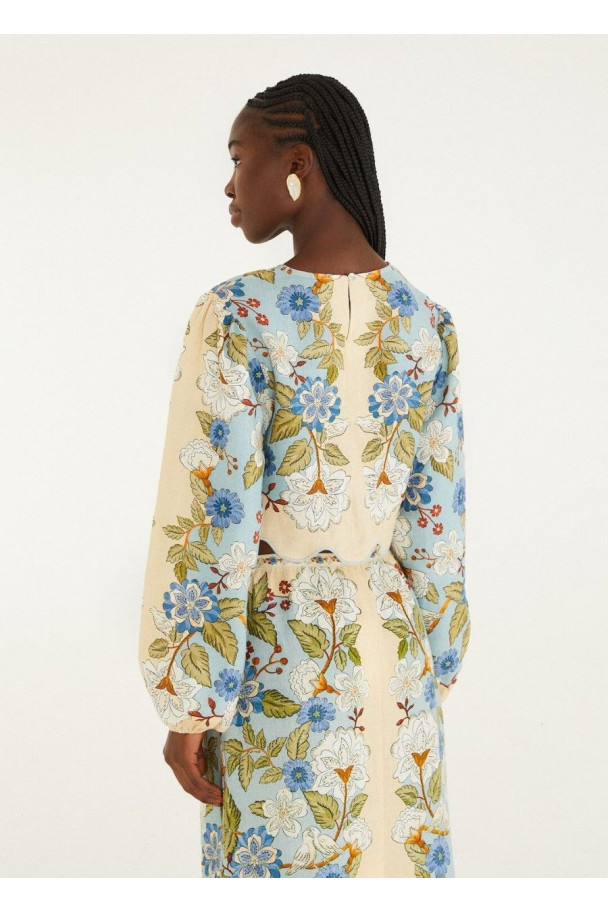 Destaca por su estampado floral en tonos azules, verdes y crema, inspirado en los pañuelos clásicos, y por el bajo festoneado, que aporta un acabado artesanal y distintivo.