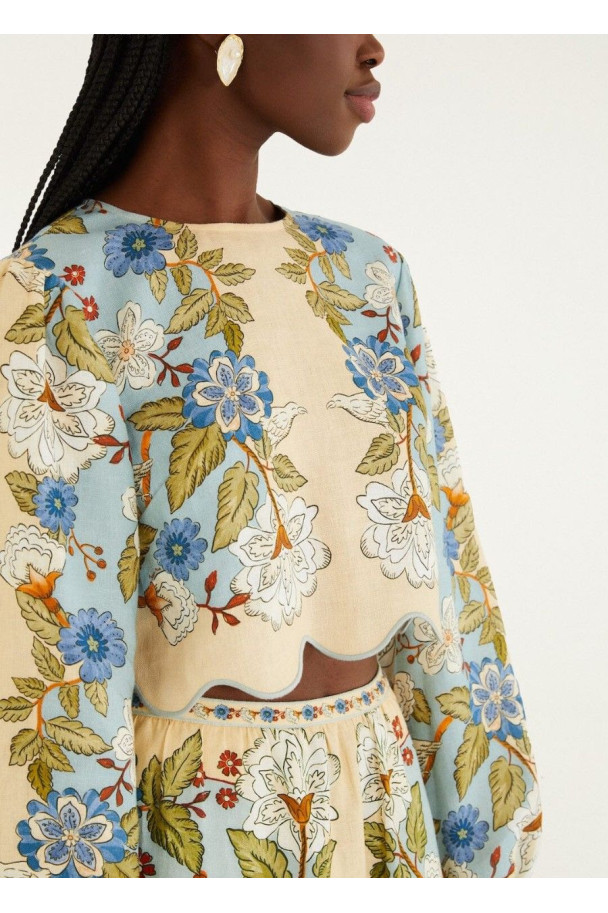 El top Garden Scarf Blue de Farm Rio es una pieza fresca y delicada que completa el conjunto con un aire romántico y sofisticado. Presenta un corte cropped y mangas largas ligeramente abullonadas, equilibrando feminidad y comodidad.