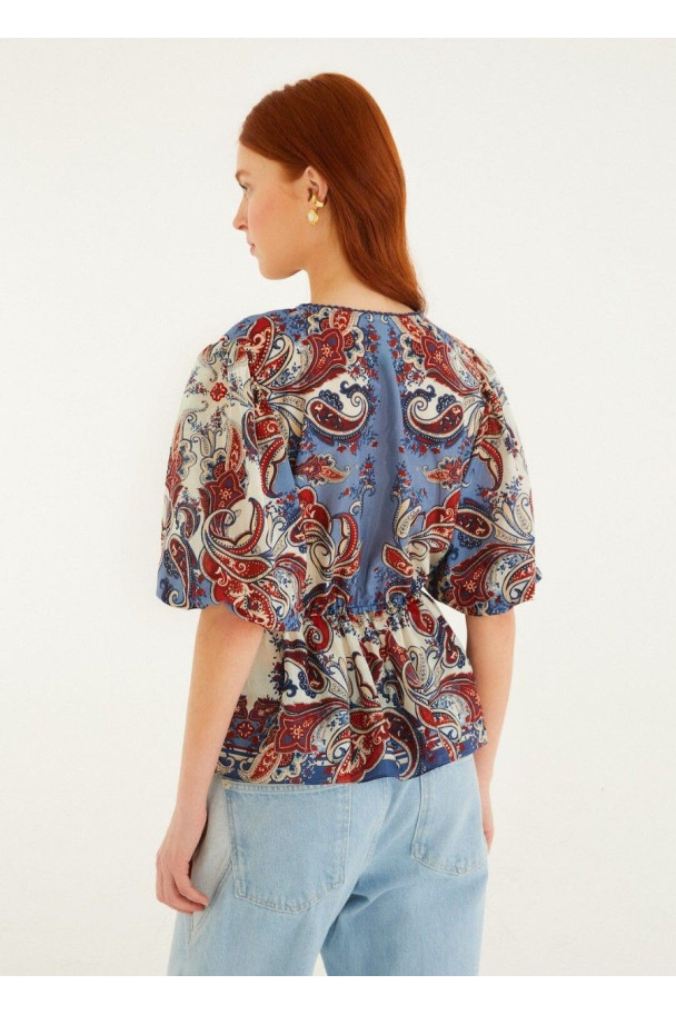 La blusa Paisley de Farm Rio destaca por su estética bohemia y su cuidada mezcla de color y detalle. Confeccionada en un tejido ligero y fluido, presenta un estampado paisley en tonos azules, rojos y crudos, inspirado en motivos clásicos reinterpretados con el sello vibrante de la marca.