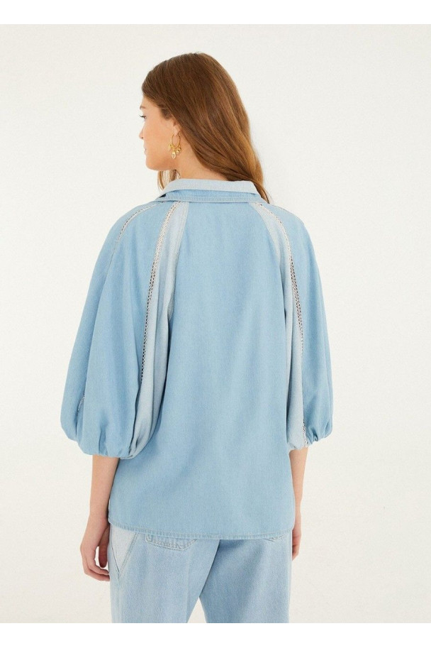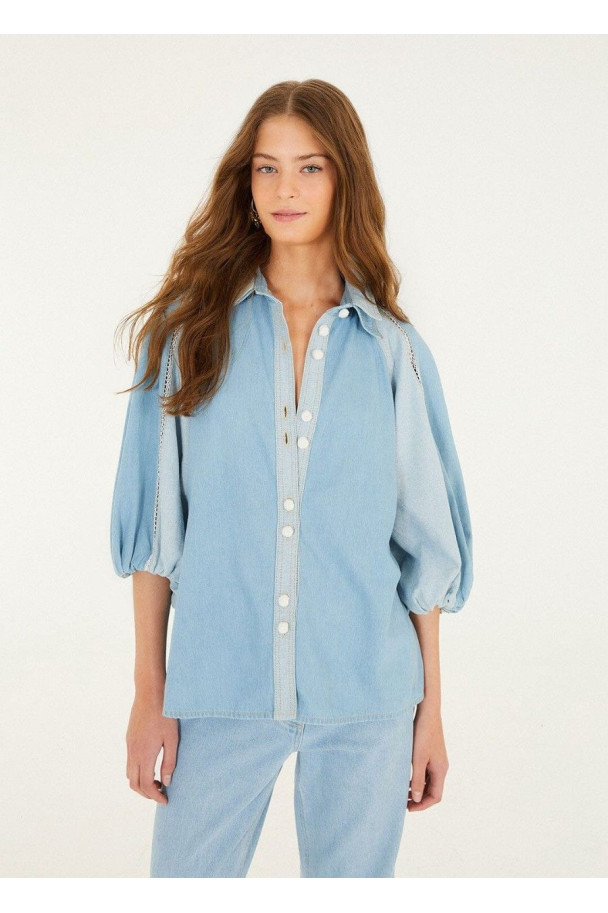 Presenta cuello camisero clásico, cierre frontal con botones y mangas abullonadas con puño fruncido, que suavizan la silueta y añaden un toque femenino. Los detalles de encaje fino en los hombros aportan un acabado delicado y artesanal, equilibrando la estructura de la prenda.