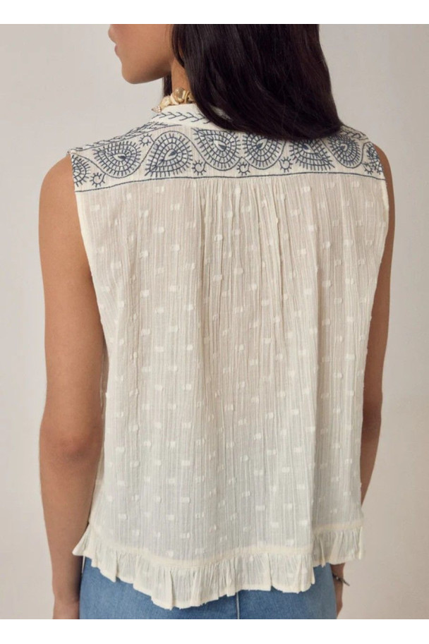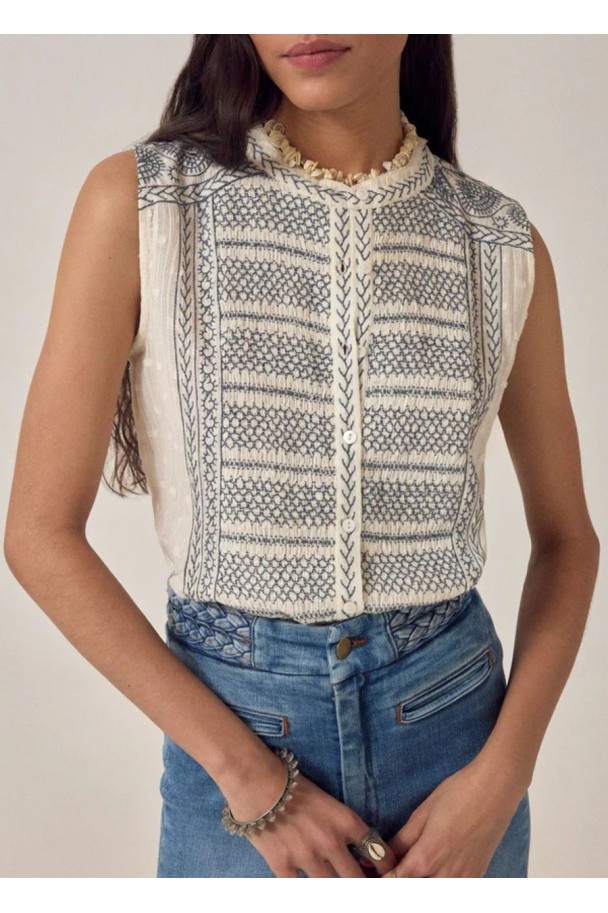 El top Irina de Maison Hotel destaca por su delicado bordado geométrico, que aporta textura y un aire artesanal.