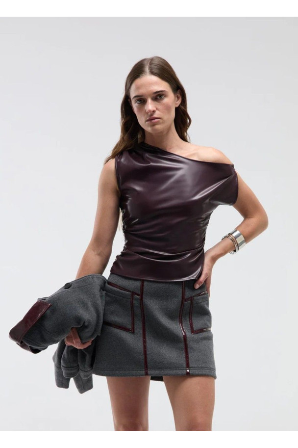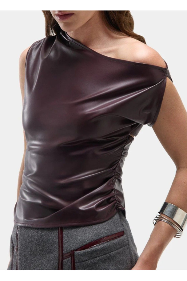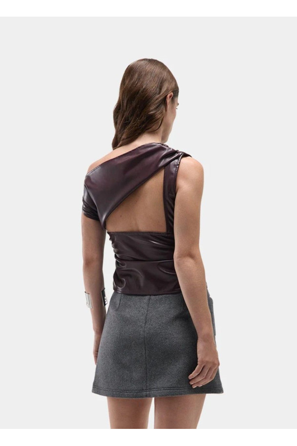 Su diseño asimétrico de un solo hombro y espalda abierta crea un efecto moderno y sofisticado, ideal para destacar en cualquier ocasión. Confeccionado en tejido efecto piel de acabado brillante, su tono burdeos profundo añade fuerza y carácter al look.