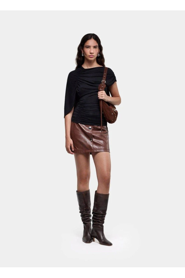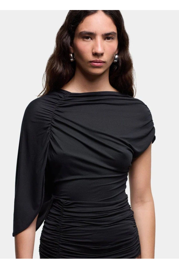 Confeccionado en un tejido suave y elástico, se ajusta al cuerpo creando un efecto drapeado que realza la figura. Su manga caída y los frunces laterales aportan movimiento y originalidad, mientras que la espalda con escote en pico añade un detalle sofisticado y sensual.