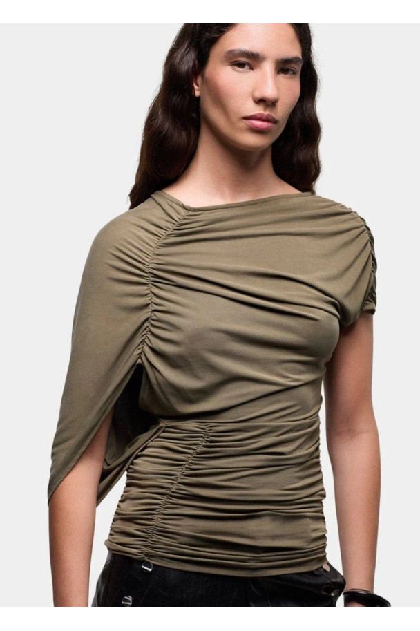 Confeccionado en un tejido suave y elástico, se ajusta al cuerpo creando un efecto drapeado que realza la figura. Su manga caída y los frunces laterales aportan movimiento y originalidad, mientras que la espalda con escote en pico añade un detalle sofisticado y sensual.