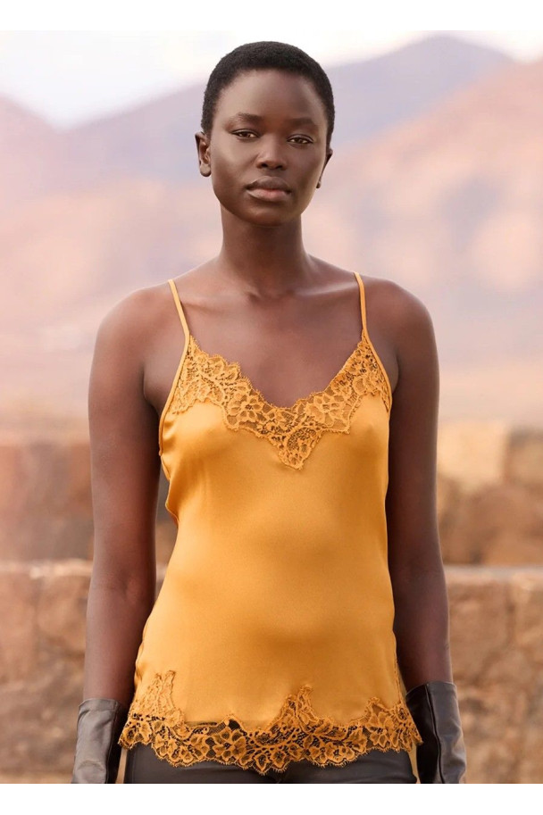El top Blavia satinado de Mes Demoiselles, en un cálido tono ocre, seduce por su acabado luminoso y su caída etérea que estiliza la figura con naturalidad.