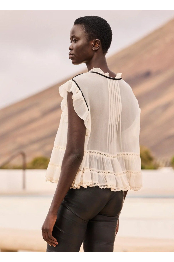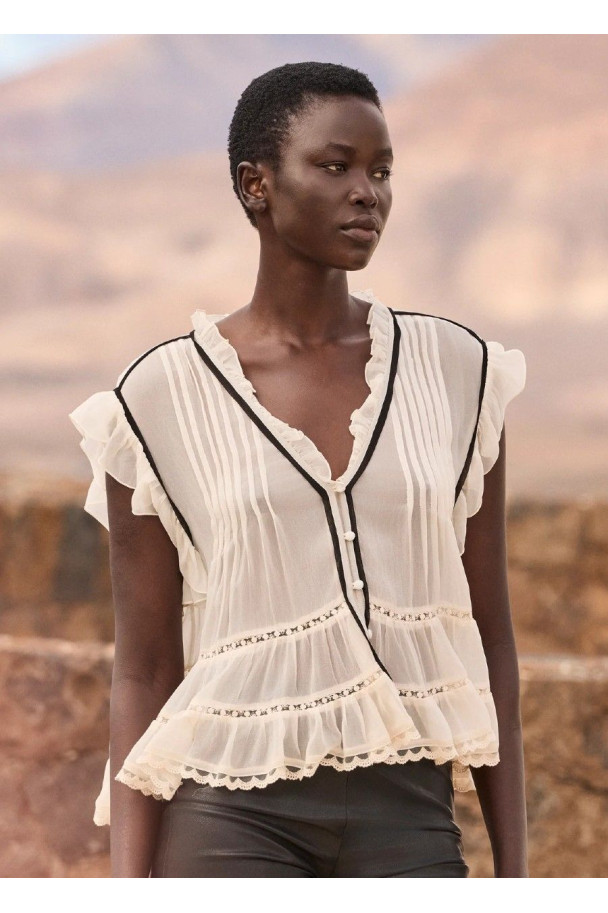 Los volantes sutiles en hombros y bajo añaden movimiento y feminidad, mientras que las pequeñas inserciones de encaje aportan un acabado artesanal y muy cuidado. Cerrado por delicados botones forrados, el top combina comodidad y estilo en una pieza versátil y atemporal.