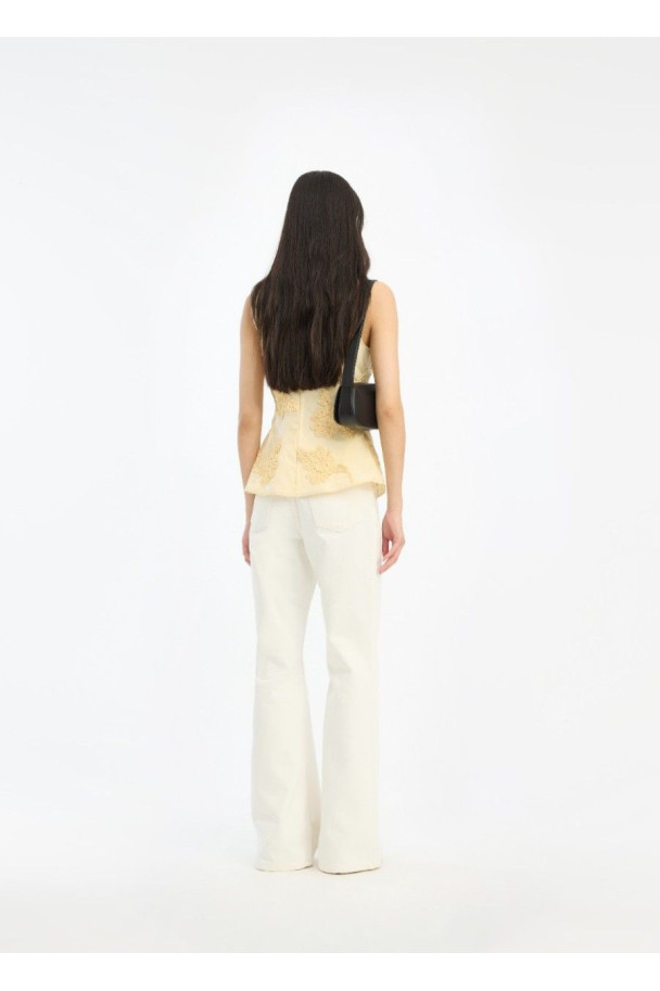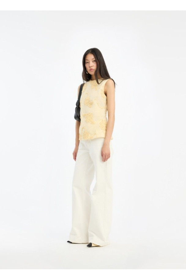 El Flower Sleeveless Top de ROTATE es un top sin mangas que destaca por su delicado bordado floral en relieve, que aporta textura y un toque femenino al diseño.