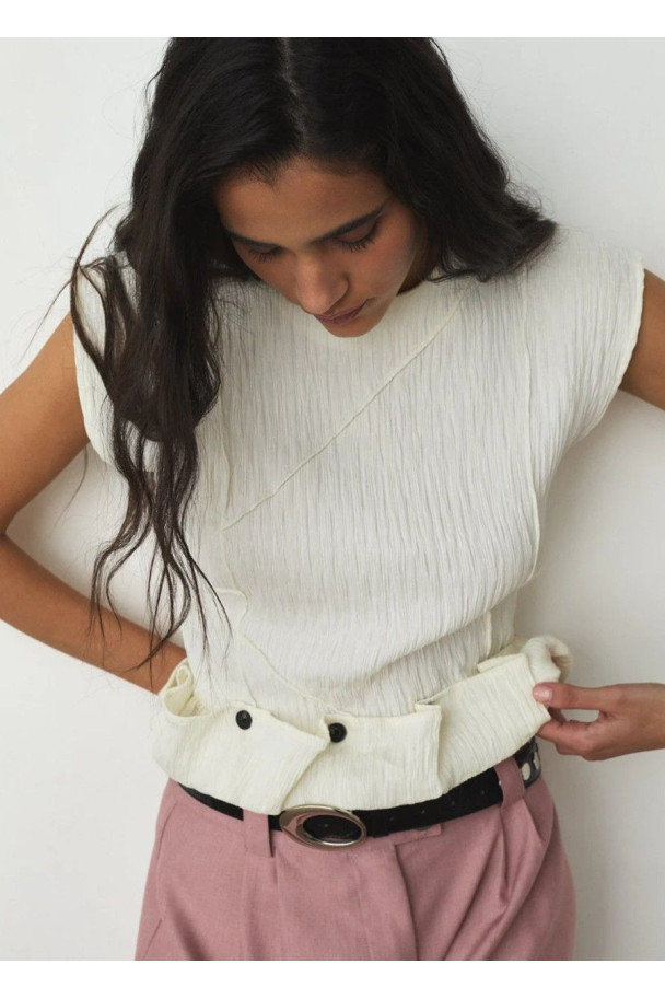 Su textura ligeramente arrugada y el corte limpio crean una pieza con presencia sutil, mientras el bajo estructurado aporta un guiño contemporáneo.