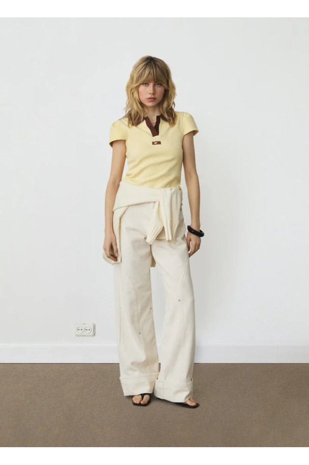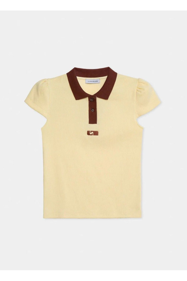Polo de punto canalé en tono amarillo suave, con silueta fitted que realza la figura y aporta un aire femenino y actual.