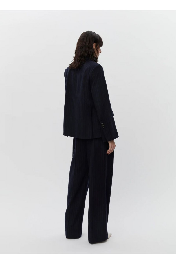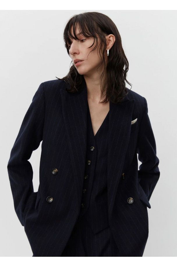 La blazer cruzada Preston cuenta con hombreras, solapa y botones en las muñecas. Además, tiene un corte clásico y presenta un estampado de raya diplomática en fondo azul marino.