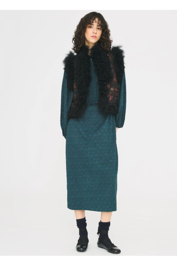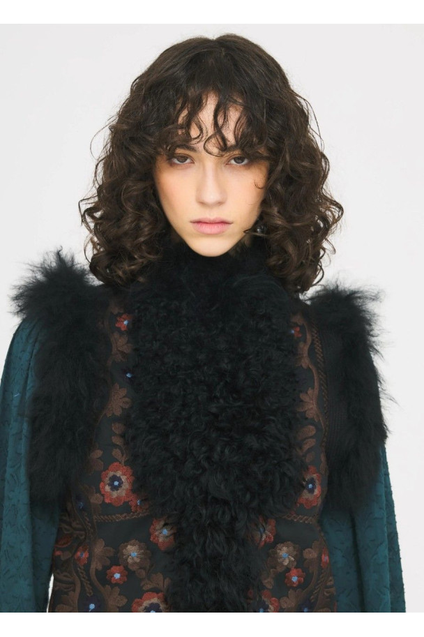 El acabado en piel rizada a lo largo del cuello y los bordes enmarca la silueta, aportando volumen y calidez.