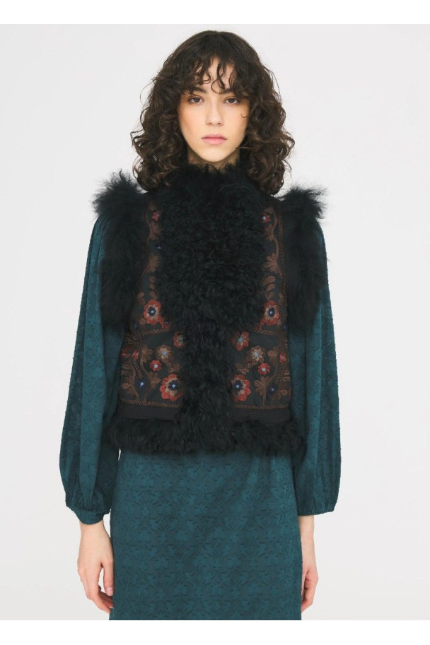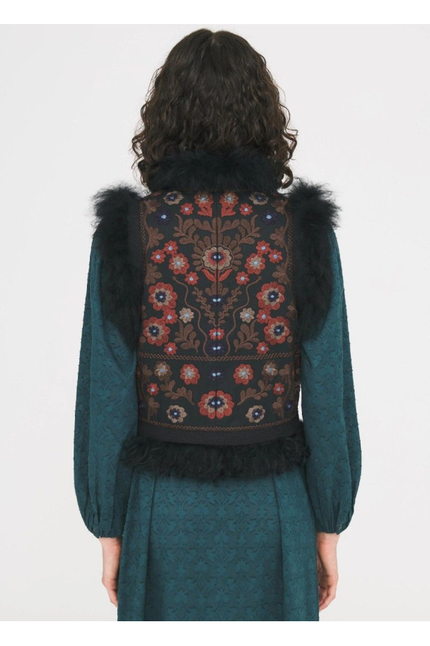 Confeccionado en algodón bordado, destaca por su base negra enriquecida con un trabajo ornamental de inspiración folclórica en tonos vivos, que resalta la riqueza de los detalles y aporta un aire bohemio y elegante.
