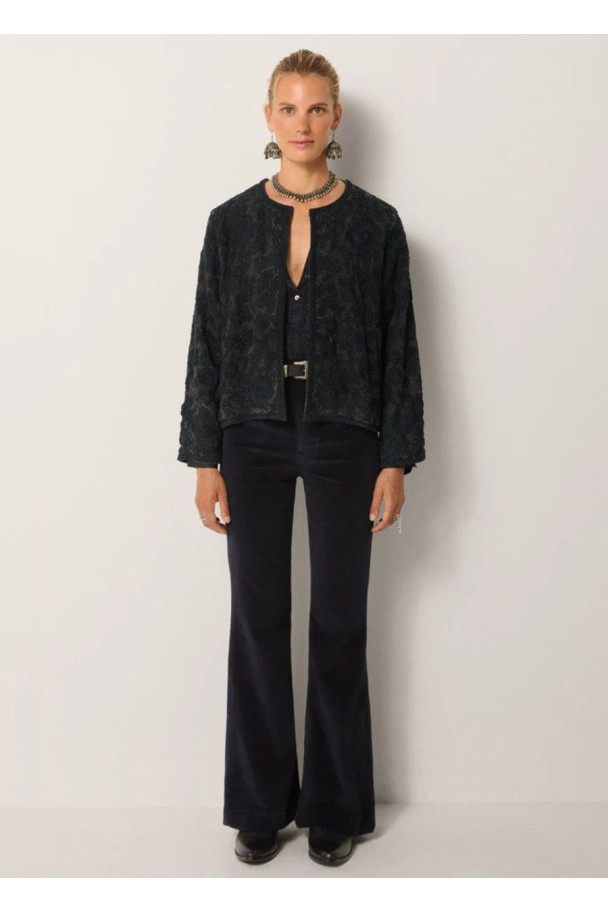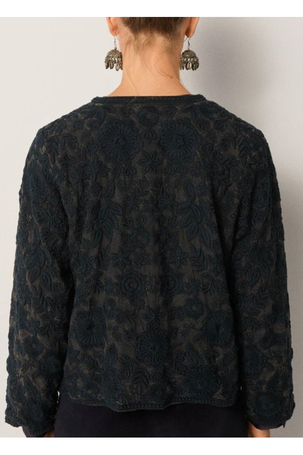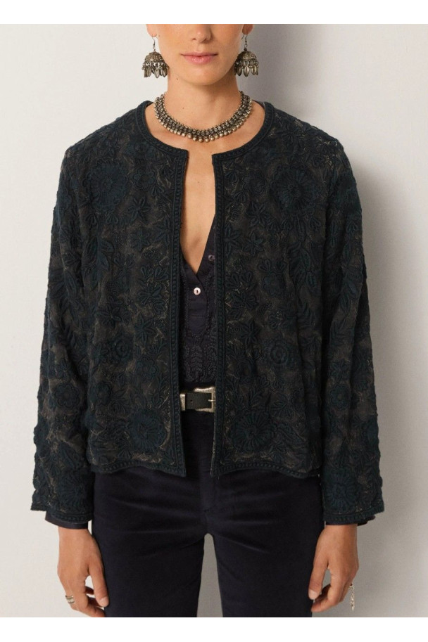 Confeccionada en un tejido de base oscura, se distingue por su intrincado bordado floral en relieve, que aporta profundidad y textura a la prenda.