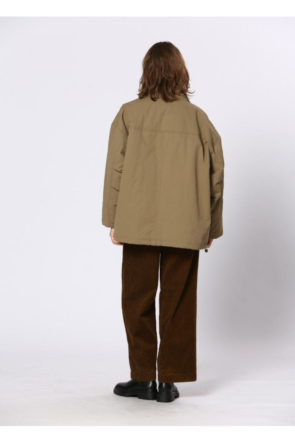 Su tono kaki lo convierte en un básico fácil de combinar con vaqueros, pana o tonos neutros, creando looks casuales con personalidad sin esfuerzo.