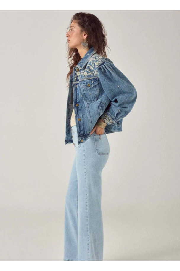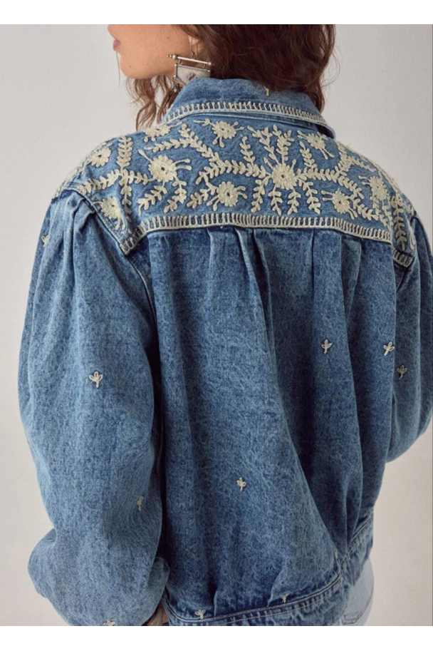 Confeccionada en vaquero lavado, incorpora bordados decorativos que aportan textura y un aire distintivo, mientras que su corte relajado la hace fácil de llevar en el día a día.