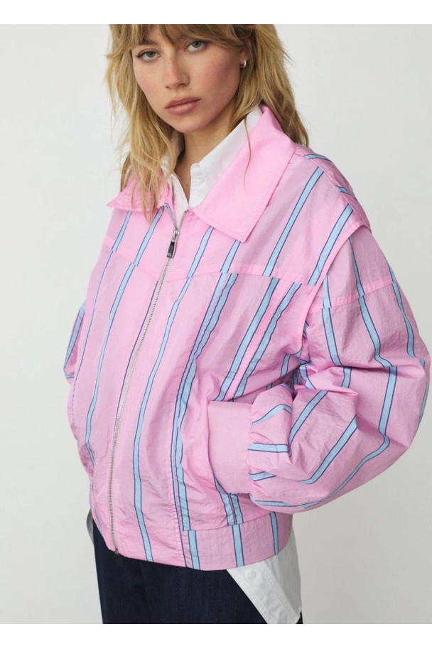 Bomber en tono rosa con estampado de rayas en contraste, que aporta un aire fresco y contemporáneo.