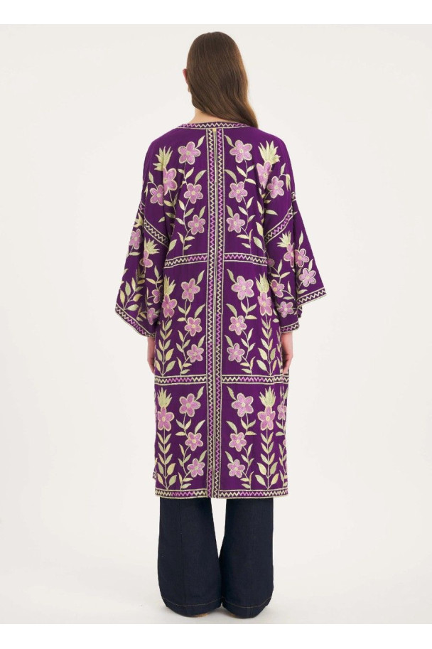 Kaftán largo en tono morado, confeccionado en tejido ligero con caída fluida.