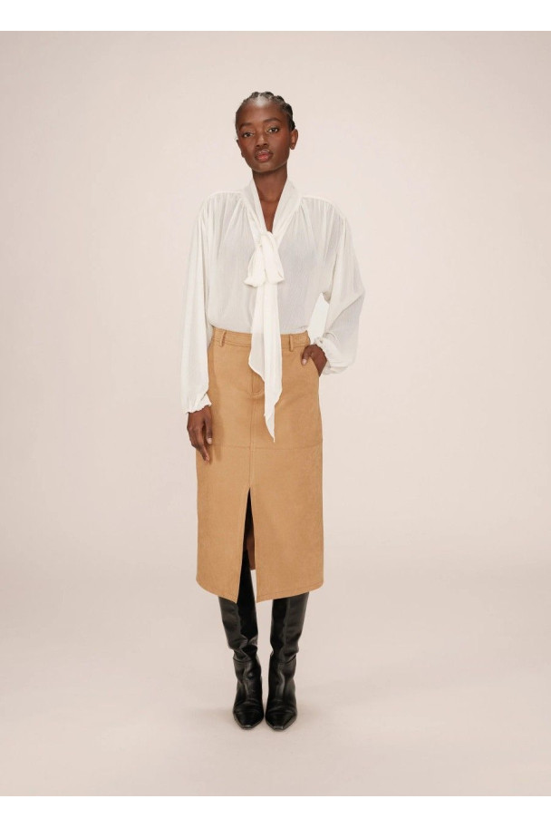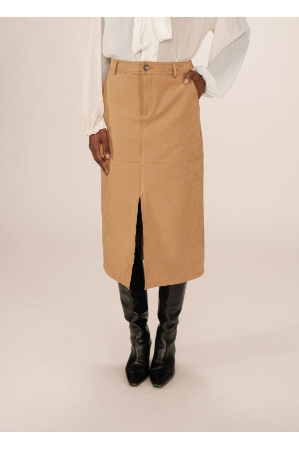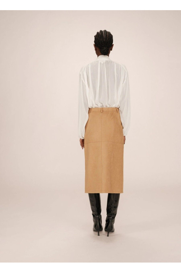 La falda Sorry en tono ocre es una prenda sofisticada que aporta un aire moderno y elegante a cualquier look.