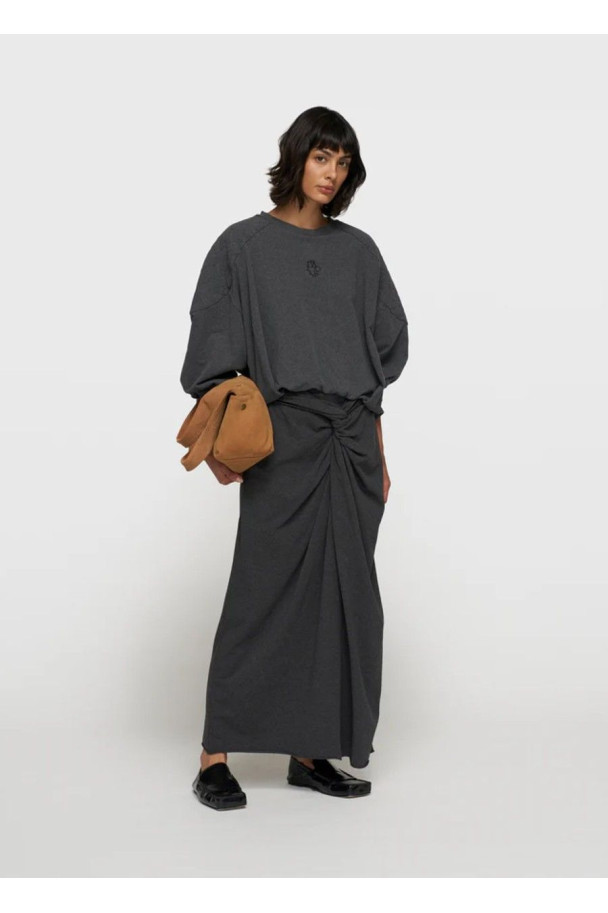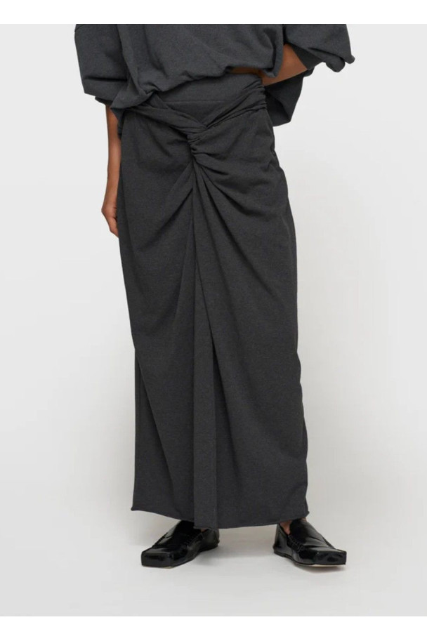 De corte largo y fluido, esta falda se distingue por su drapeado delantero, que crea un efecto de nudo sutil aportando estructura y movimiento a la silueta.
