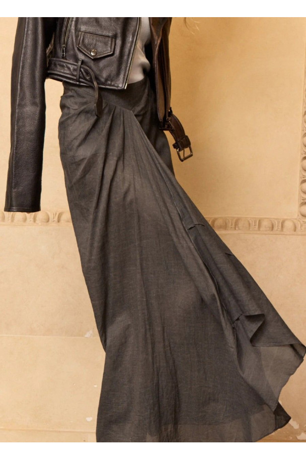 Falda larga de corte fluido con diseño envolvente y detalle drapeado en la parte frontal, que aporta movimiento y elegancia.