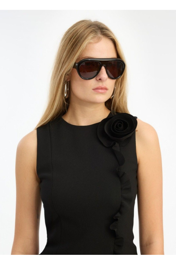 Su silueta aviador redondeada, junto con las lentes oscuras, la superficie lisa y brillante y las patillas anchas, crea un diseño equilibrado, sofisticado y con personalidad.