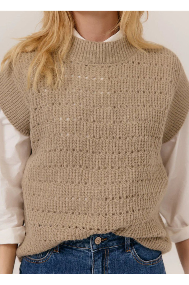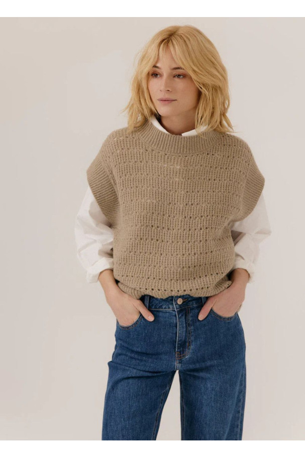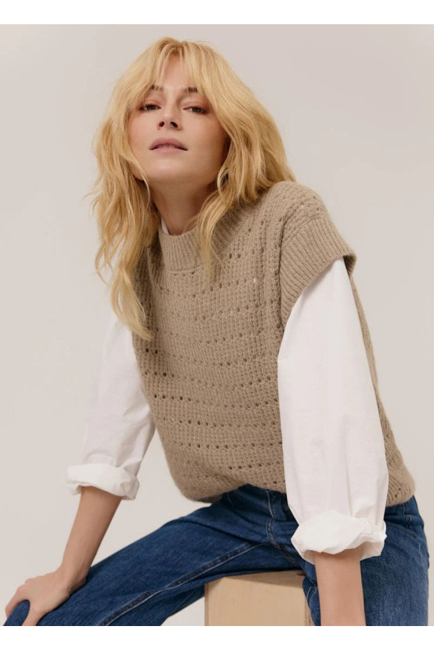 Con su diseño tipo chaleco de punto y cuello redondo, aporta un toque contemporáneo y desenfadado. Su textura suave y su color beige neutro lo convierten en una pieza versátil y fácil de combinar, perfecta para superponer sobre camisas o blusas y crear un estilo relajado pero sofisticado.