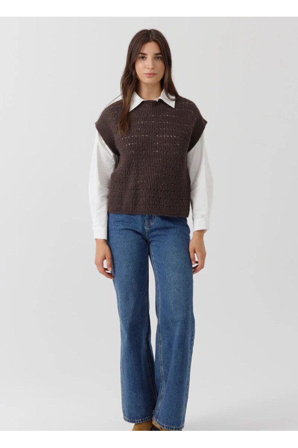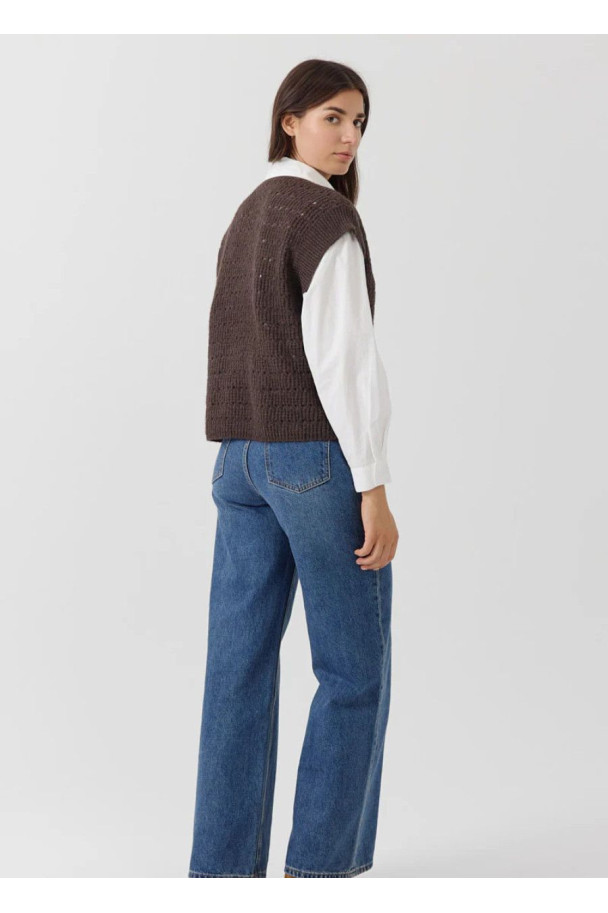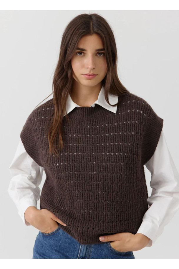 Con su diseño tipo chaleco de punto y cuello redondo, aporta un toque contemporáneo y desenfadado. Su textura suave y su color marrón neutro lo convierten en una pieza versátil y fácil de combinar, perfecta para superponer sobre camisas o blusas y crear un estilo relajado pero sofisticado.
