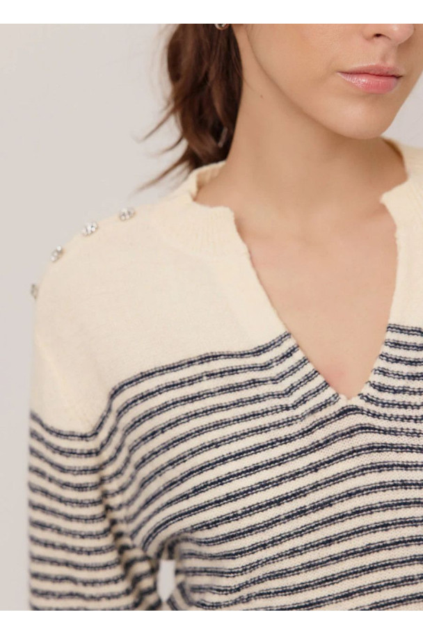 Su diseño marinero con rayas y escote en pico aporta frescura y naturalidad, mientras que los botones decorativos en los hombros añaden un detalle elegante y distintivo.