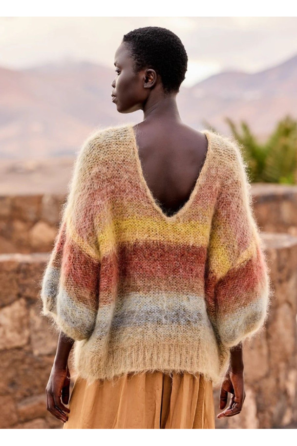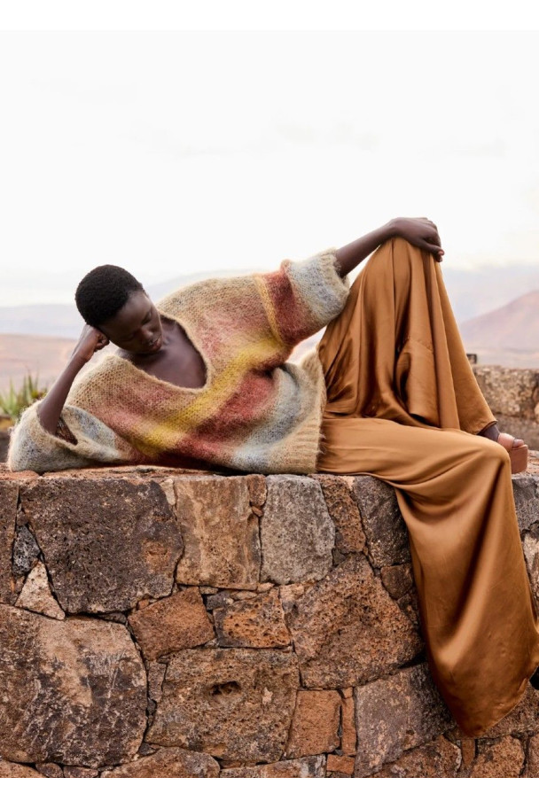 Su diseño a rayas en tonos tierra y matices pastel crea un efecto degradado muy característico de la firma, aportando un aire bohemio y armonioso.