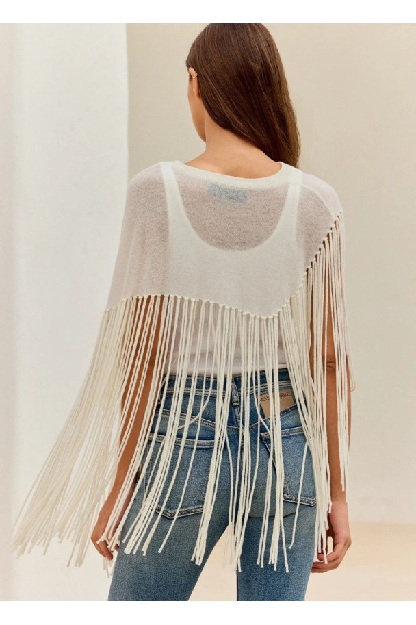 Destaca por sus flecos largos que recorren el bajo y se prolongan en las mangas, creando un movimiento continuo y muy expresivo al caminar.