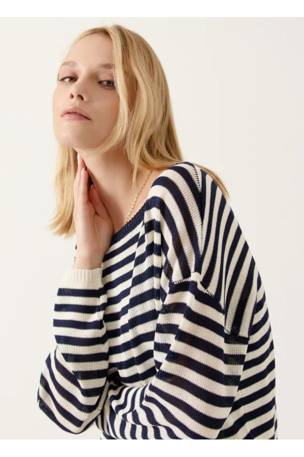 Jersey de rayas en contraste azul marino y crudo, confeccionado en punto ligero que aporta comodidad y suavidad.