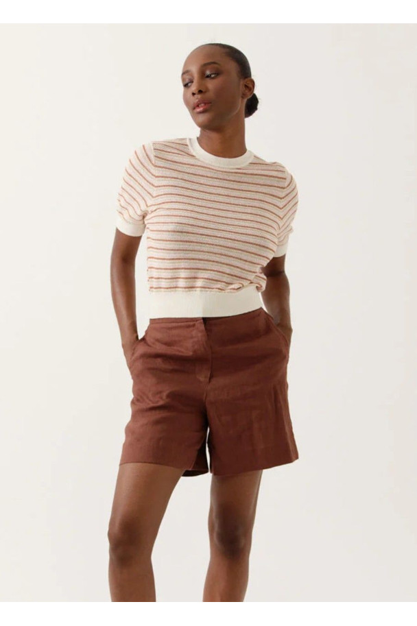 Presenta un corte ajustado con manga corta y cuello redondo, creando una silueta favorecedora y femenina.