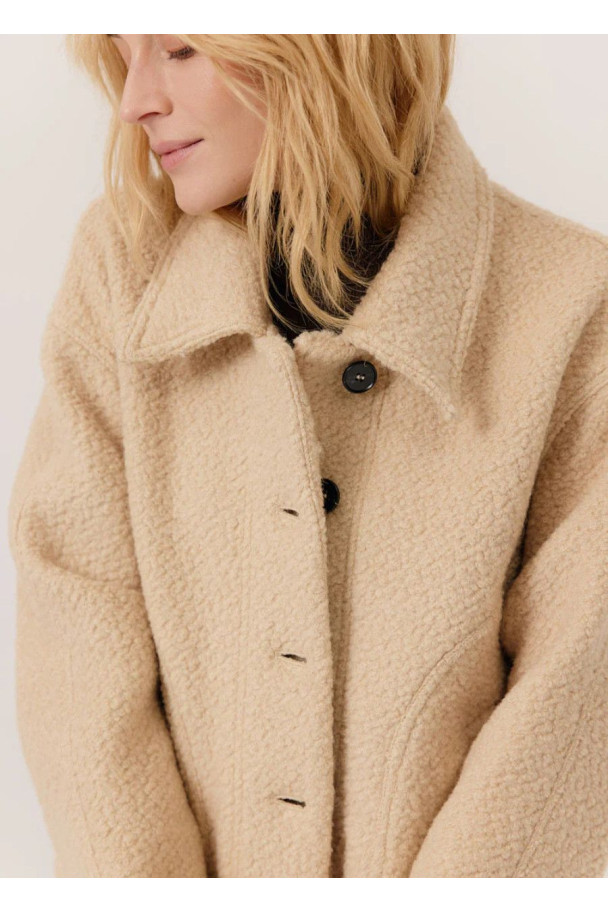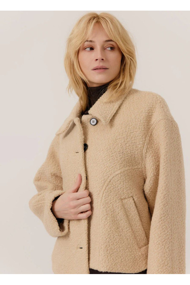 Confeccionada en un suave tejido mezcla de lana y poliéster, destaca por su textura tipo bouclé que aporta volumen y un toque acogedor. Su diseño de corte amplio, cuello clásico y cierre de botones frontales crea una silueta moderna y atemporal, ideal para los días más fríos.