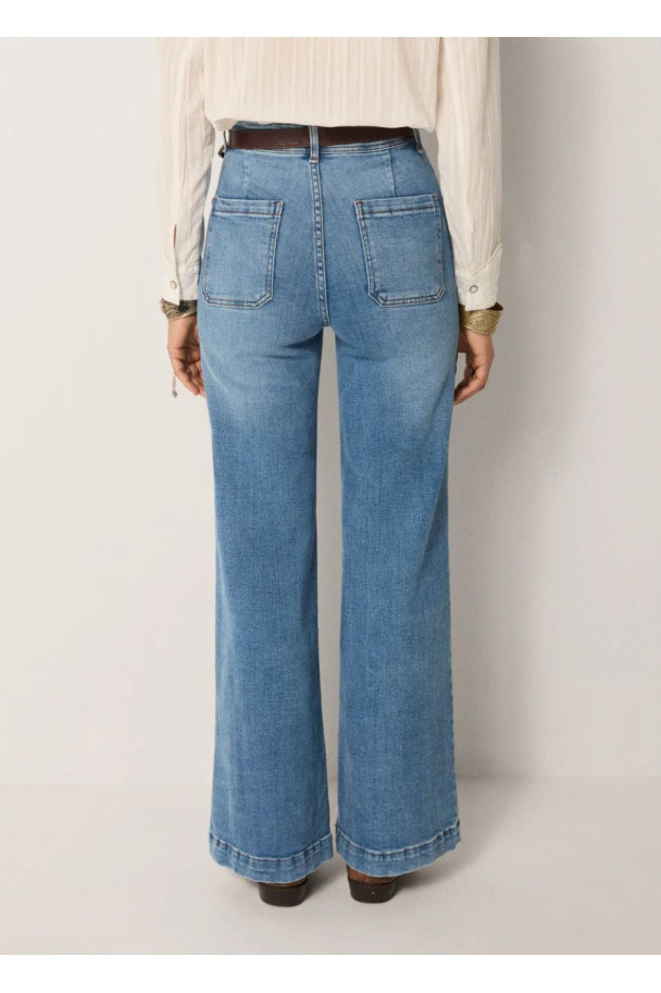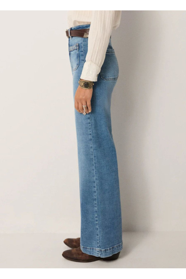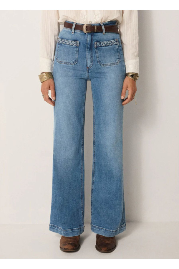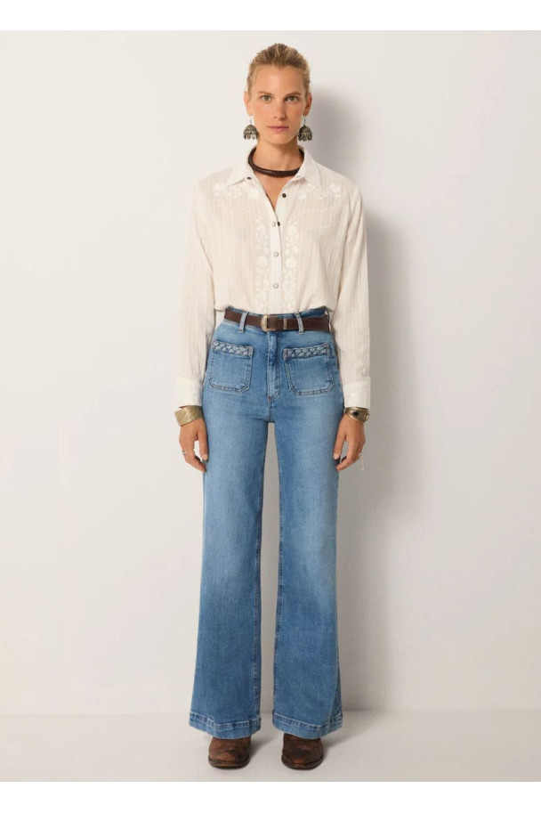 Inspirado en los cortes setenteros, presenta una silueta de pierna ancha y talle alto que estiliza la figura y aporta un aire retro sofisticado. Los bolsillos delanteros con detalle trenzado añaden un toque artesanal distintivo, mientras que el tejido denim suave y ligeramente elástico garantiza comodidad sin perder estructura.