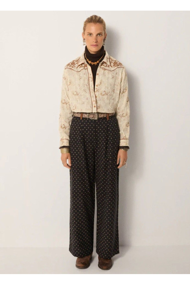 El pantalón Diega, redefine la elegancia bohemia con una silueta fluida y un estampado de aire retro que evoca el espíritu libre y sofisticado de la marca.