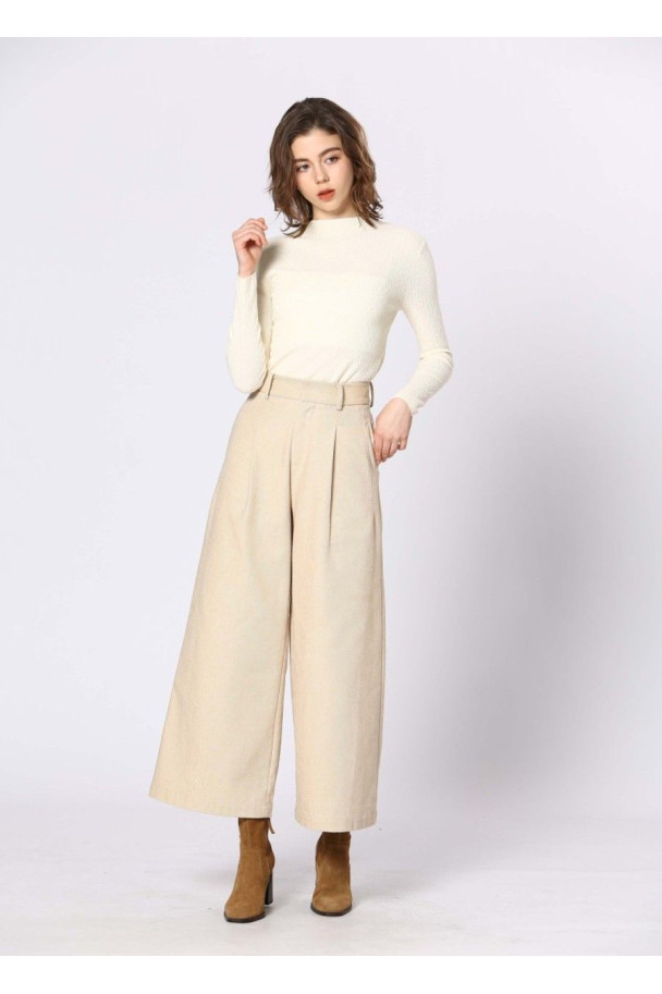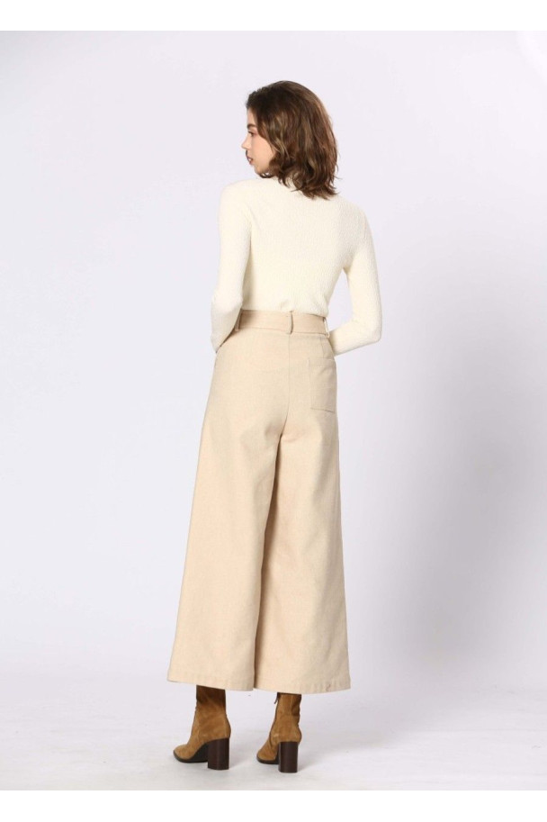 Confeccionado en un tejido suave y estructurado, destaca por su corte de pierna ancha y tiro alto, que estiliza la figura aportando comodidad y movimiento.