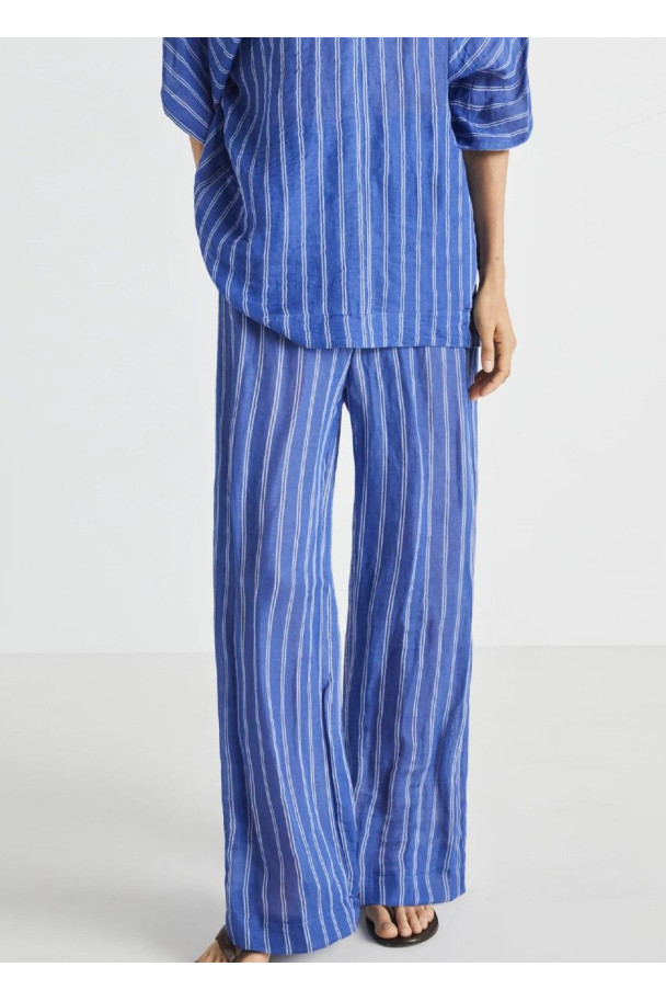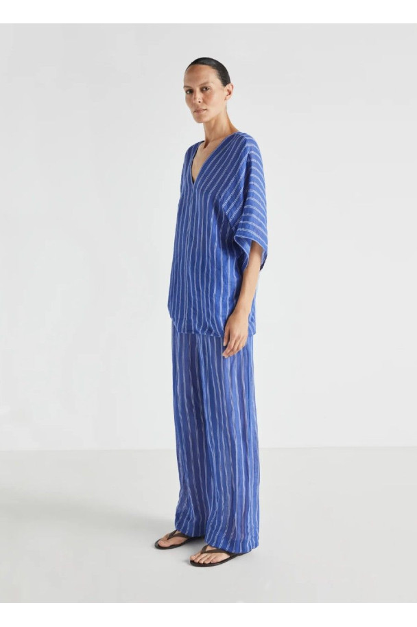 El estampado de finas rayas verticales en azul aporta frescura y profundidad visual, alargando la figura y reforzando su carácter atemporal.