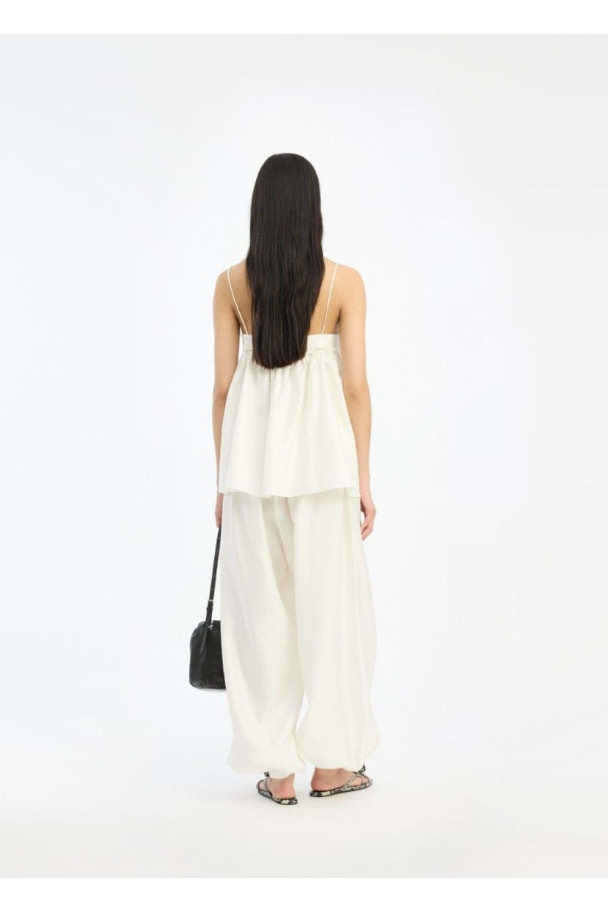 Los Striped Balloon Pants de ROTATE son unos pantalones de silueta amplia y ligera que destacan por su tejido fluido con sutil textura a rayas.
