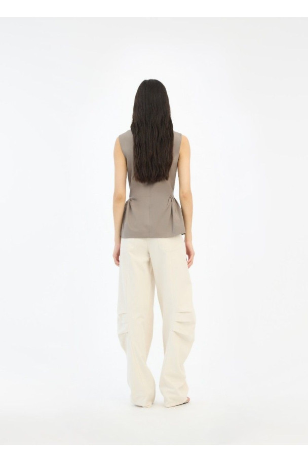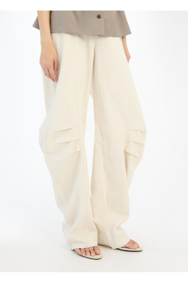 Su diseño presenta una silueta amplia con volumen en la pernera, realzada por pliegues estructurados, que crean una forma moderna y sofisticada.