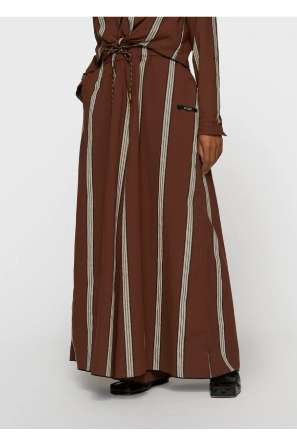 El pantalón Wide Leg Stripes destaca por su silueta amplia y su estampado de rayas verticales en tonos cálidos, que estilizan la figura y aportan un toque sofisticado.