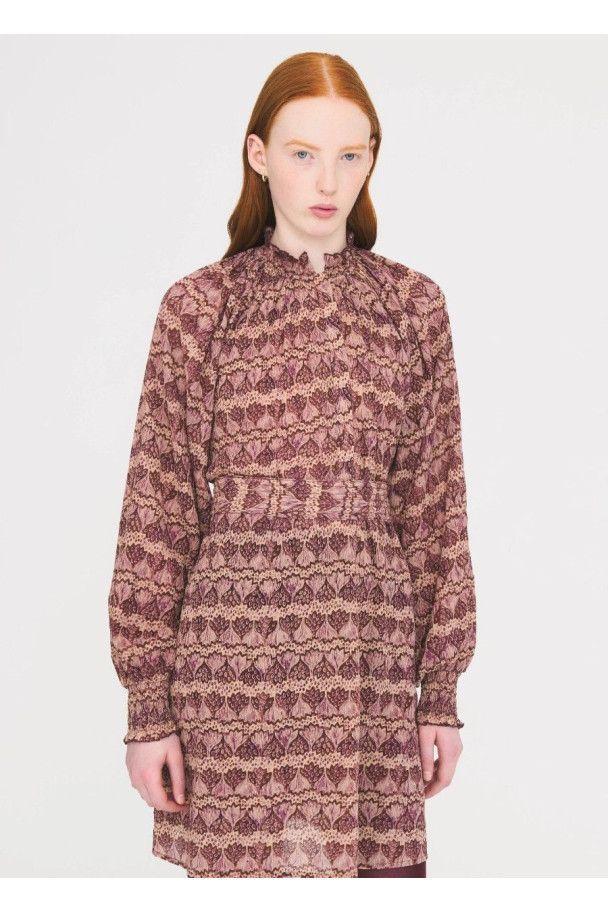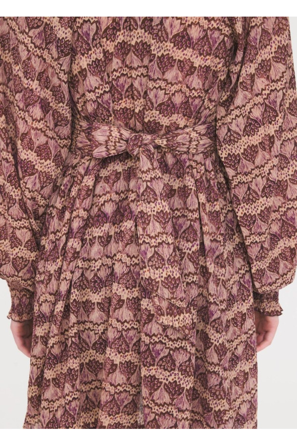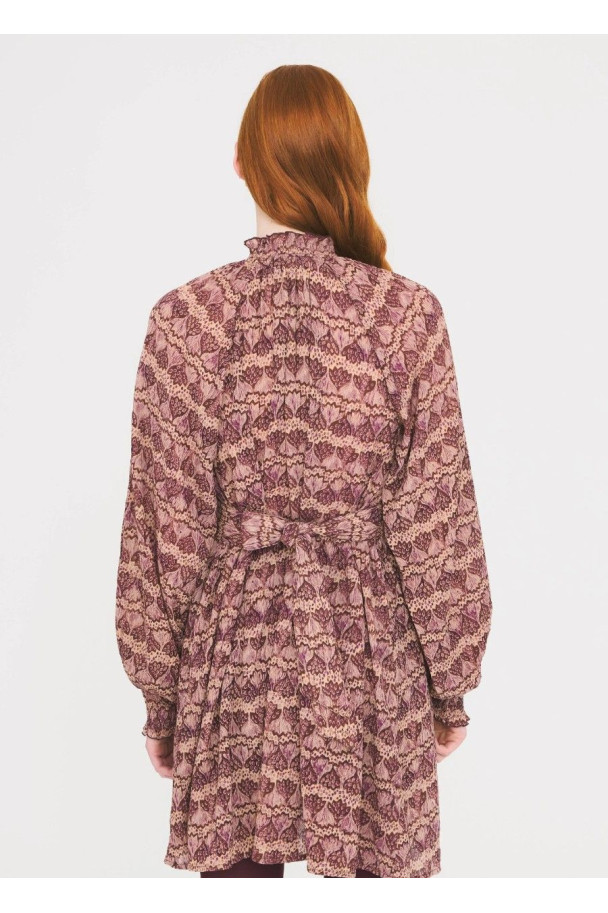 Su estampado artístico en tonos empolvados crea un efecto visual único y delicado, mientras que el lazo en la cintura permite ajustar la silueta de forma favorecedora, resaltando la figura sin perder amplitud ni movimiento.