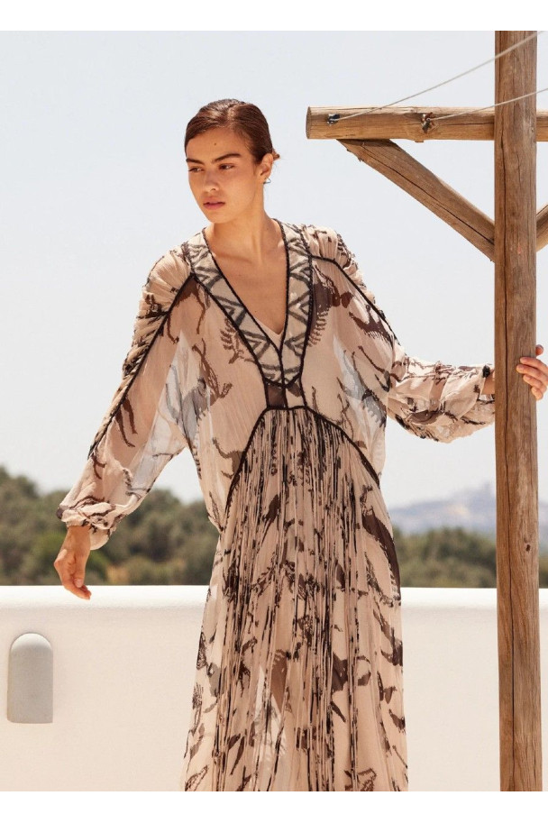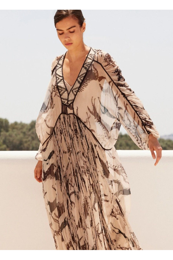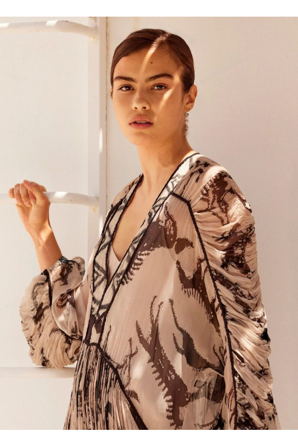 Su estampado artístico, delicadamente difuminado, crea un efecto casi pictórico que envuelve la figura con una elegancia orgánica y sutil.