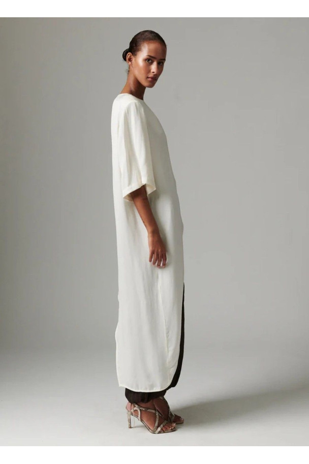 El vestido Lolly es una prenda de estética minimalista y contemporánea que destaca por su silueta fluida y su diseño asimétrico.