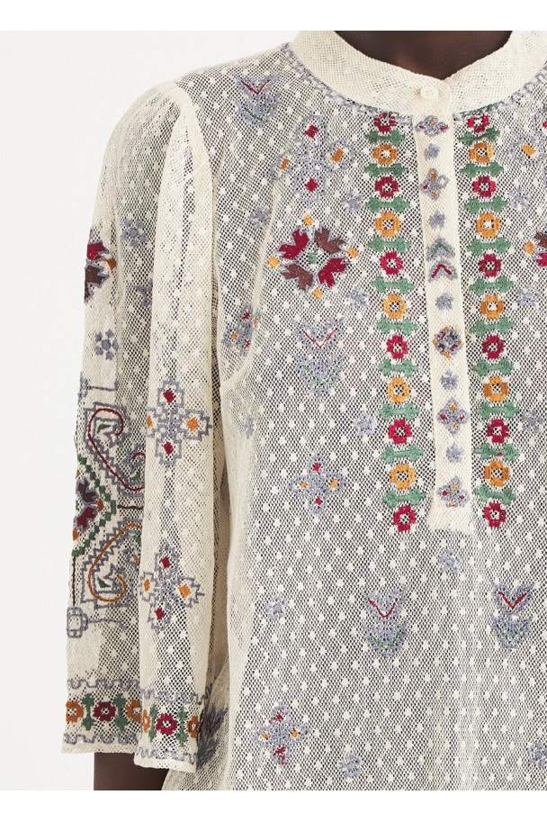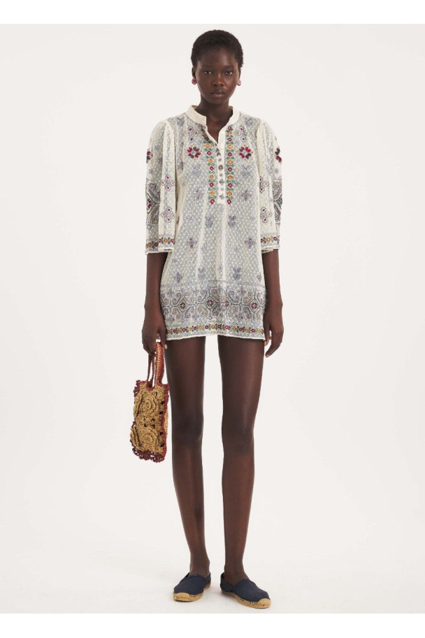 Destaca por sus bordados multicolor de inspiración artesanal, con detalles florales y geométricos que recorren toda la prenda.