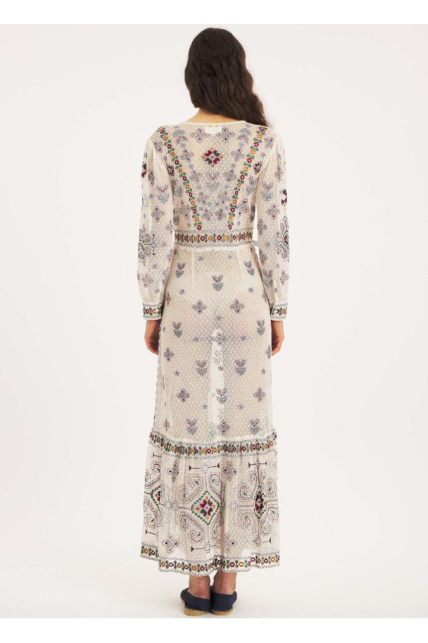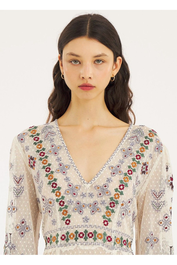 Destaca por sus bordados multicolor de inspiración artesanal, con motivos florales y geométricos que recorren toda la prenda.