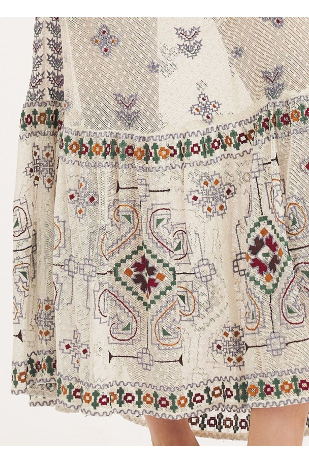 El bajo con detalles más elaborados aporta riqueza visual y movimiento, convirtiéndolo en una pieza elegante y versátil, ideal para ocasiones especiales o looks bohemios sofisticados.