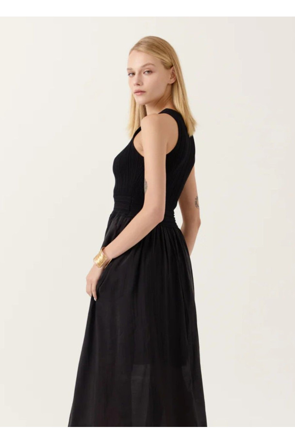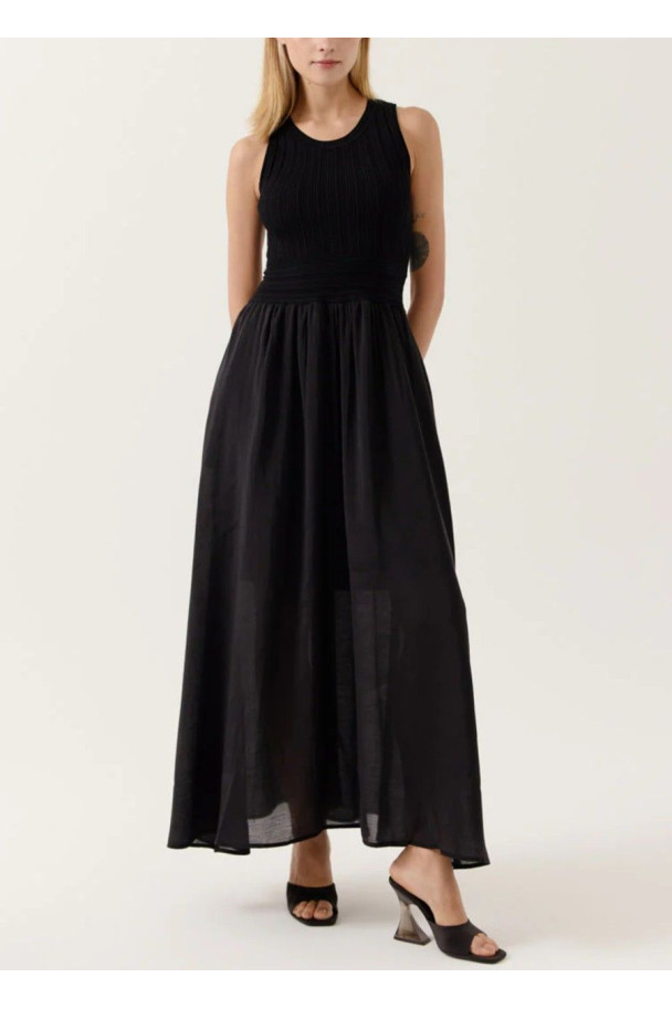 Vestido largo en color negro que combina un cuerpo de punto ajustado con una falda fluida de gran movimiento.